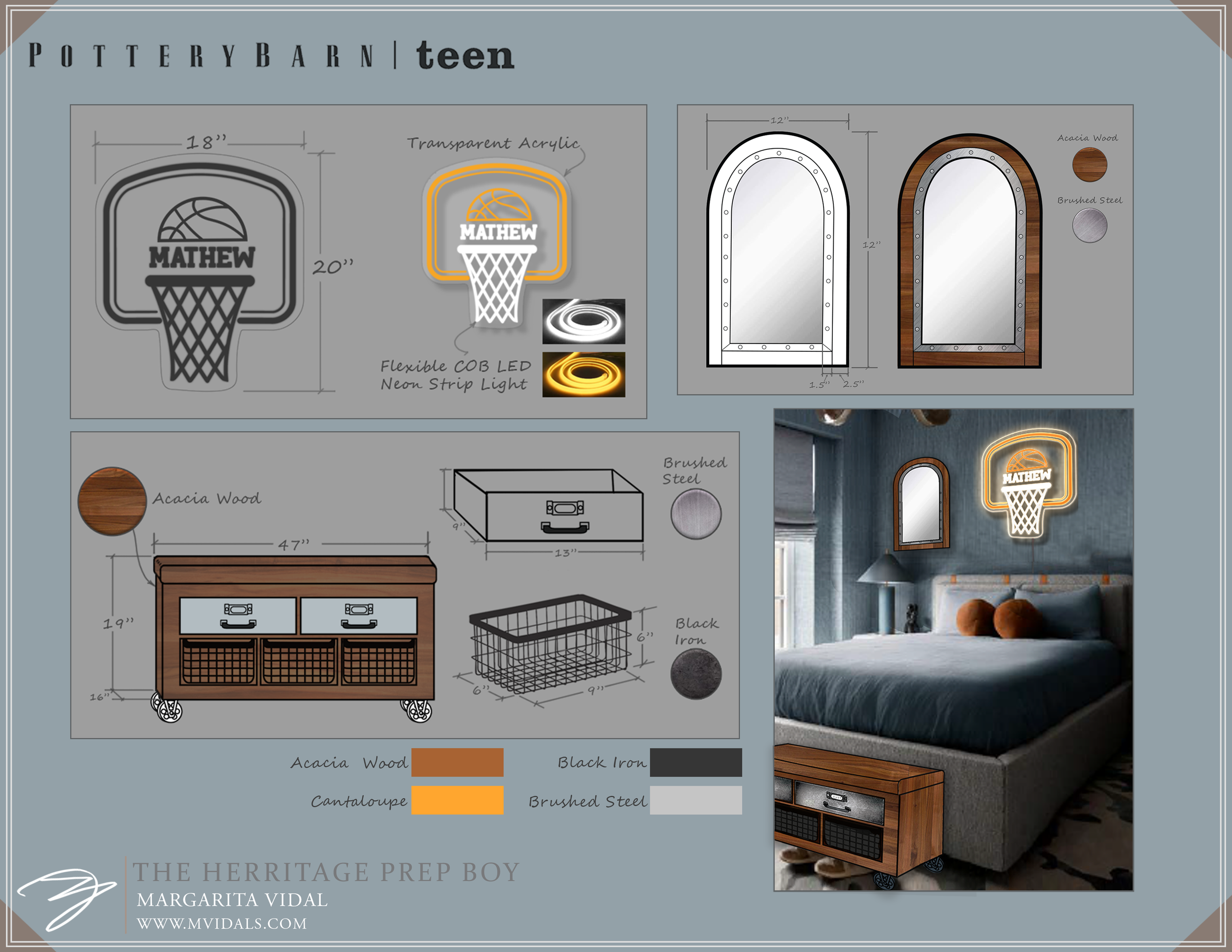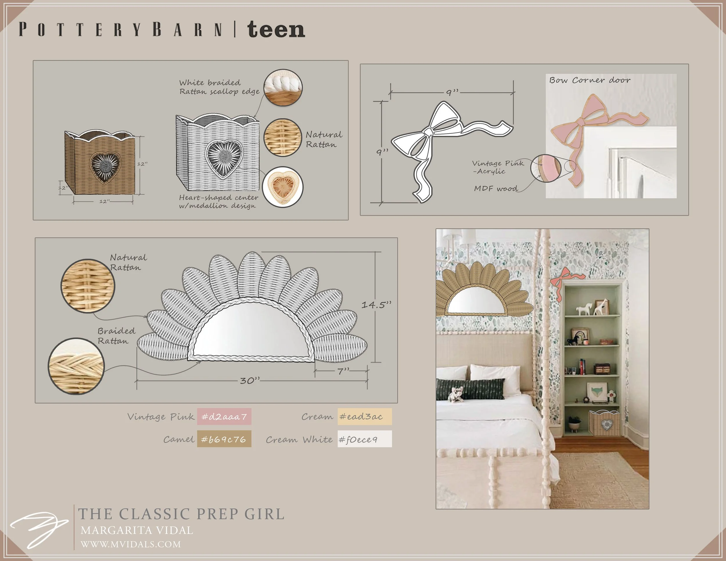 The client for the project below was Pottery Barn Teen. The objective was to design 3 hard-line products for bedroom: mirror, wall decor and a storage item for each category, Boy and Girl Teen. The themes were: The Classic Prep Girl and The Heritage Sport Prep Boy. An inspiration picture of each bedroom was provided to give a deeper sense of the esthetic and vibe. Below are the initial inspiration images.